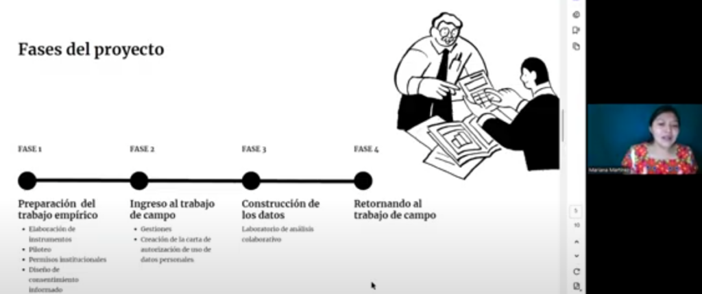 Mariana compartió su valioso trabajo de tesis sobre las trayectorias educativas de estudiantes sordos en la educación superior en México. Su enfoque de investigación colaborativa y comprometida nos desafió a repensar la relación tradicional entre investigador y participante. En su estudio, el estudiantado no son “sujetos”, sino “colaboradores epistémicos”. Uno de los puntos más relevantes fue la decisión de los propios estudiantes de no ser anonimizados para no invisibilizar sus experiencias, lo que implicó un complejo proceso legal y ético para proteger sus datos personales sin ocultar sus identidades. Esta investigación es un ejemplo de cómo co-construir conocimiento desde un diálogo interlingüístico e intercultural, desarrollando una propuesta metodológica con un enfoque de epistemología sorda.